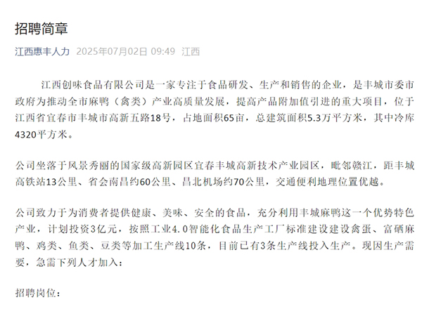 江西創味食品有限公司是一家專注于食品研發、生產和銷售的企業,是豐城市委市政府為推動全市麻鴨(禽類)產業高質量發展,提高產品附加值引進的重大項目,位于江西省宜春市豐城市高新五路18號,占地面積65畝,總建筑面積5.3萬平方米,其中冷庫4320平方米。公司坐落于風...